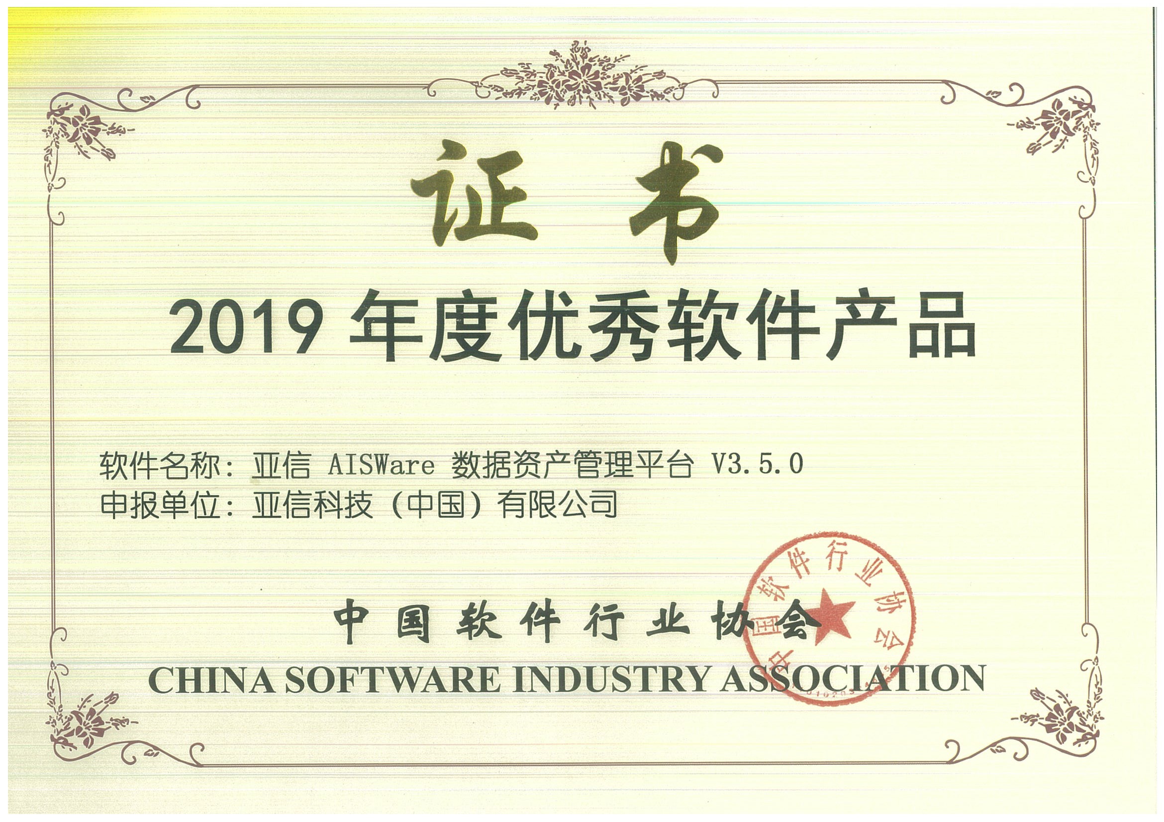 2019年12月 亚信AISWare数据资产管理平台V3.5.0荣获“2019年度优秀软件产品”