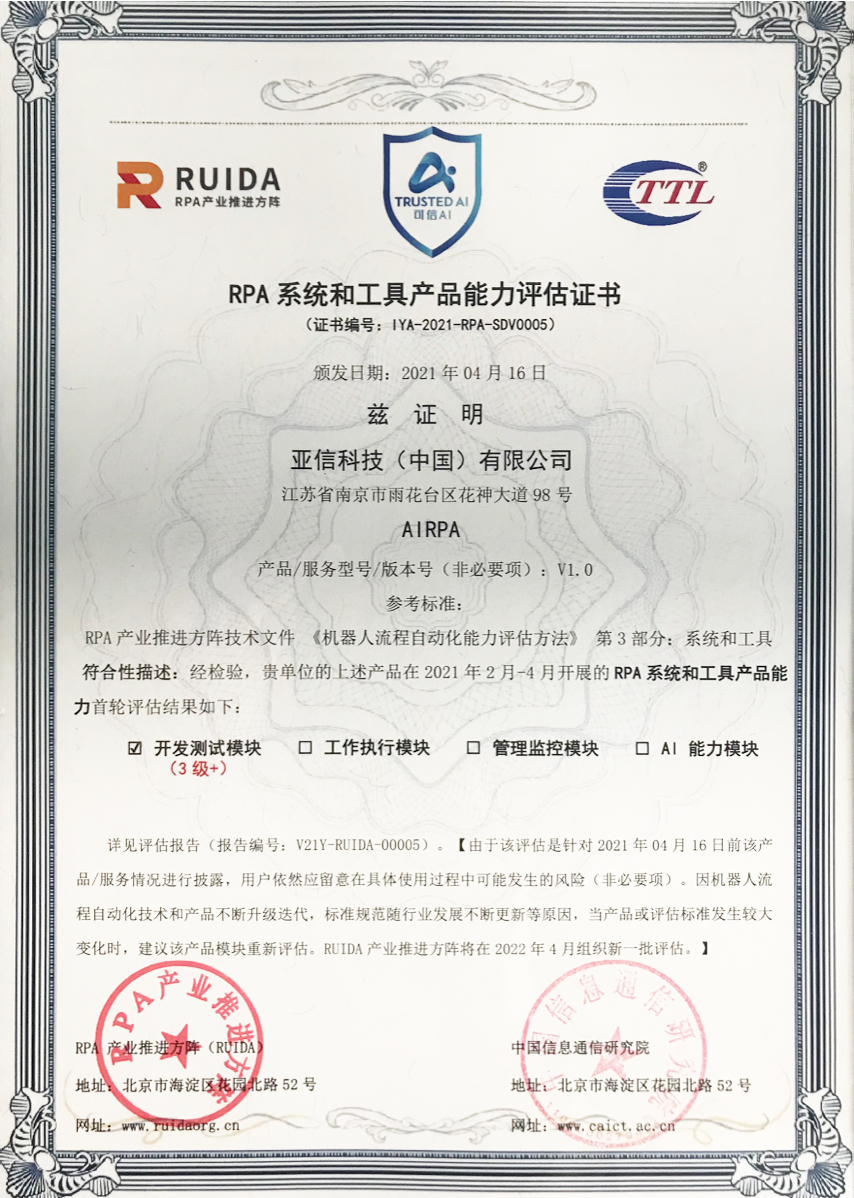 2021年4月 304am永利集团AIRPA产品获“RPA系统和工具产品能力评估证书