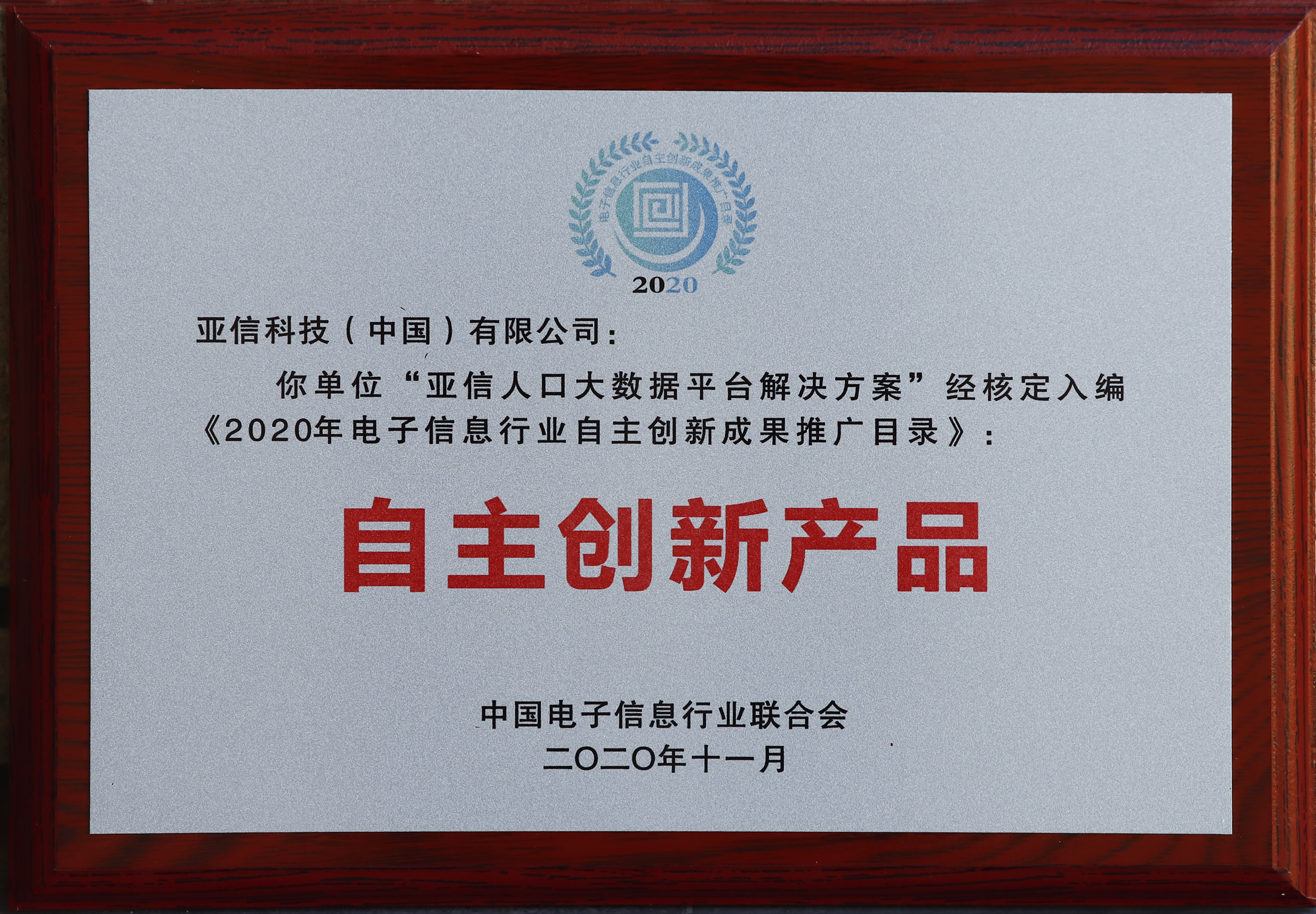 2020年11月 亚信人口大数据平台解决方案荣获“自主创新产品”
