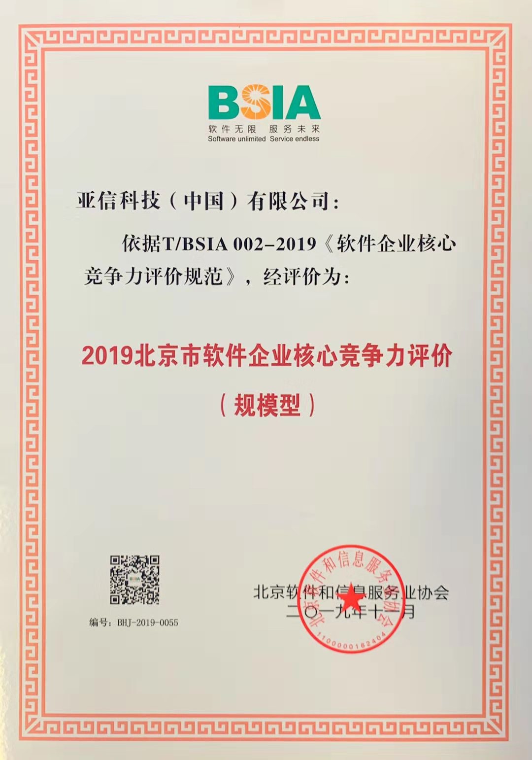 2019年12月 304am永利集团荣获“2019北京市软件企业核心竞争力评价(规模型)”