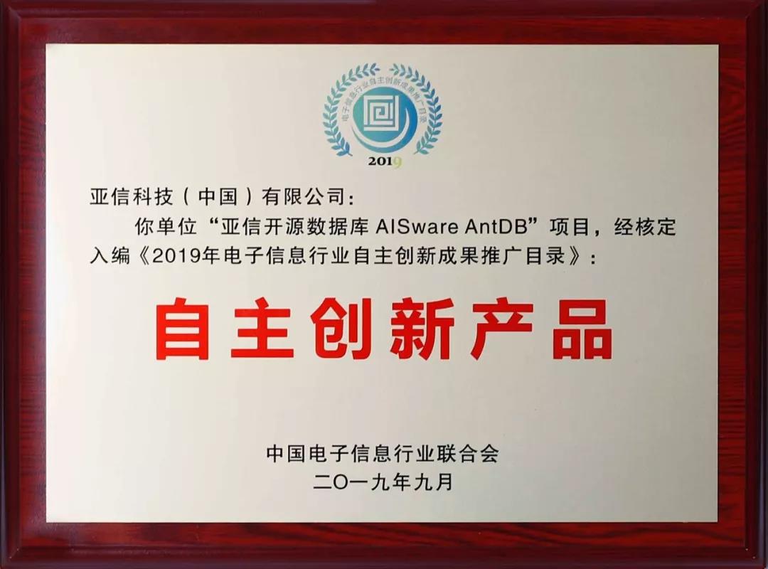 2019年9月 亚信开源数据库AISware AntDB荣获“自主创新产品”